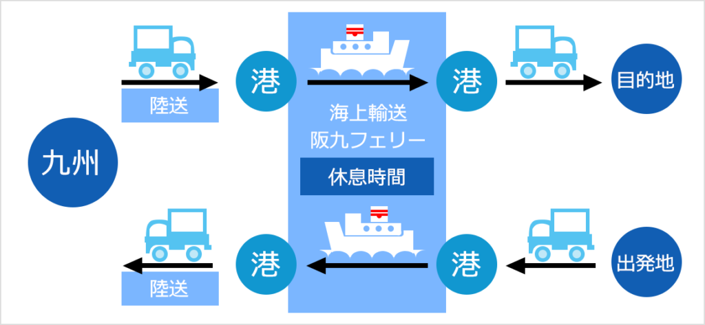 中間の輸送を、フェリーを利用することにより輸送費や、労働費の削減などを効率よく行うことが出来ます。