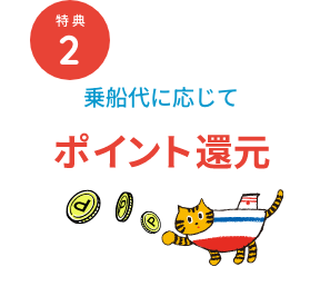 還元されたポイントは1ポイント=1円として、10円単位から乗船代にご利用いただけます。ポイントを利用して乗船代をお支払いした場合、ポイント分を引いた乗船代に応じてポイントを還元します。※要事前カード決済